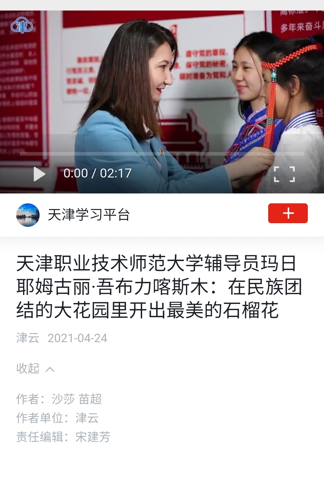 今日《进修强邦》天津进修仄台、《津云》imgedu202.jpg以“正在平易近族联合的年夜花圃里启出最好的石榴花”为题,道述吉祥体育指导员玛日耶姆古丽·吾布力喀斯木的小说。
